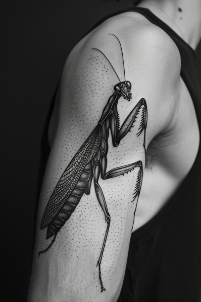 This tattoo features an intricately detailed blackwork design of a praying mantis. The tattoo artist used fine linework and dot shading to give the mantis a realistic yet artistic look, emphasizing its angular limbs and textured body. The wings, legs, and even the delicate antennae are brought to life with striking precision, creating a tattoo that feels bold yet refined. The dot shading around the mantis gives it an almost halo effect, subtly lifting the creature off the skin and adding depth to the piece.