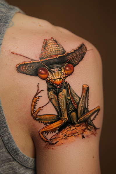 This tattoo brings a playful twist to the usual praying mantis design by adding a sombrero! The mantis is inked with vibrant details, from its large, shiny eyes to its spindly legs, but the real standout is the oversized hat perched on its head. The shading and colors give the mantis a realistic yet cartoonish look, making the whole piece fun and whimsical.