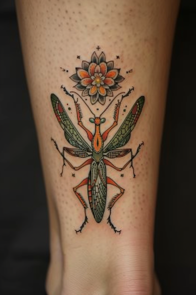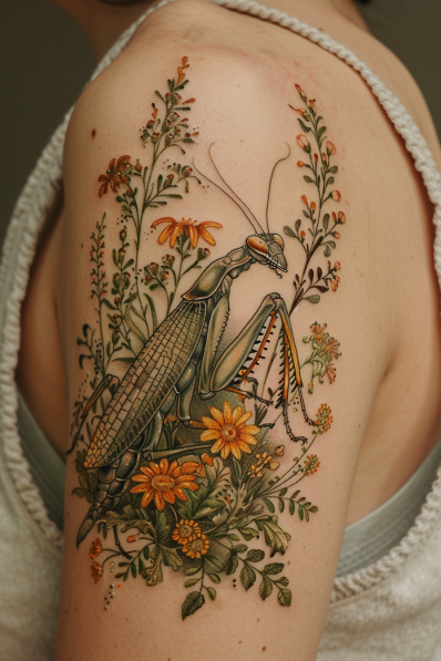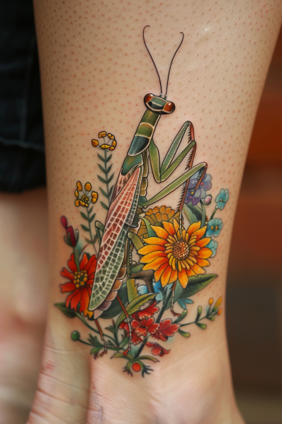 Praying Mantis Tattoo with Bright Floral Surroundings