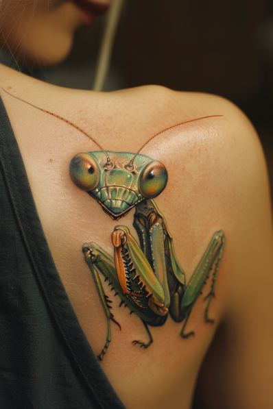 What I absolutely love about this tattoo is how strikingly lifelike the mantis is! It s not just a tattoo, but more like a little creature hanging out on your shoulder. The 3D effect is so well executed that you almost expect it to move. Personally, I think this tattoo is an awesome choice for someone who loves hyper-realistic designs and isn t afraid to turn heads. It s playful, a bit quirky, and definitely a conversation starter!