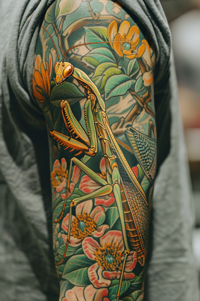 This tattoo beautifully blends the praying mantis with a vibrant, floral arrangement. The mantis is perched delicately among intricate flowers and greenery, giving the design an organic, natural feel. The warm orange and green tones of the flowers complement the mantis, making it appear as though the insect is perfectly at home in its environment. The attention to detail in the flowers and leaves is stunning, with delicate shading and vibrant colors bringing the entire tattoo to life.