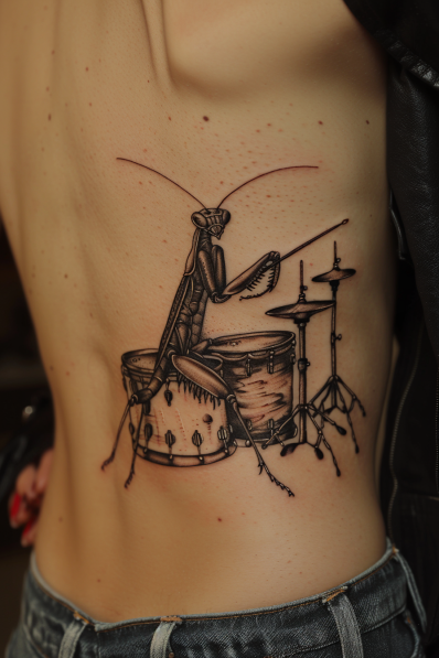 Drumming Praying Mantis Tattoo with a Musical Twist