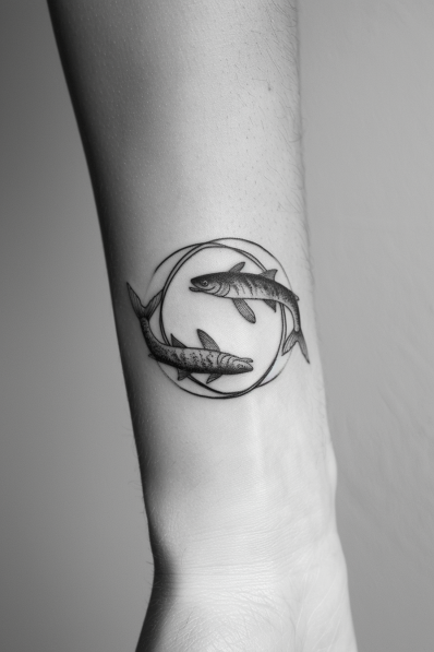 This elegant tattoo features two sardines swimming in a yin-yang-inspired circular formation, symbolizing balance and harmony. The sardines are beautifully detailed with soft shading and fine linework, while the simple circle enclosing them adds a clean and cohesive touch. The minimalistic approach makes this design both timeless and meaningful.