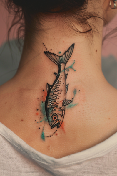 This playful tattoo brings a sardine to life with a burst of watercolor splashes in vibrant hues of teal and orange. The fish is illustrated with bold outlines and intricate details, giving it a crisp look that contrasts beautifully with the soft, flowing watercolor background. The dotted accents and subtle shading add depth, making the design feel artistic and dynamic.