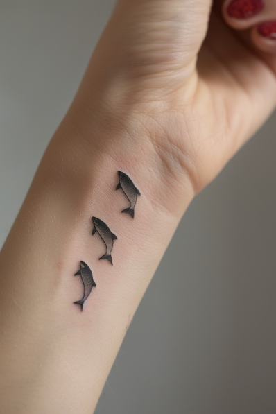 This charming tattoo showcases three tiny sardines swimming in a simple, elegant formation. Each fish is delicately shaded with fine lines, giving them a subtle yet detailed appearance. The minimalist style keeps the design clean and timeless, while the small size makes it an ideal choice for someone looking for a discreet and meaningful piece.