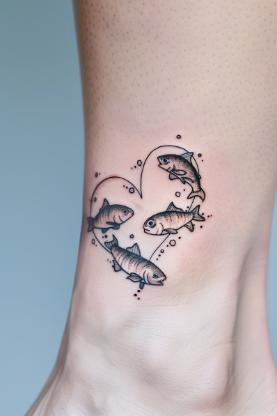 This adorable tattoo features four playful sardines swimming together to form the shape of a heart. The design is accentuated by soft dotted lines and bubbles that give it a sense of motion and liveliness. Each sardine is finely detailed with light shading and expressive features, making the piece feel balanced and full of personality.