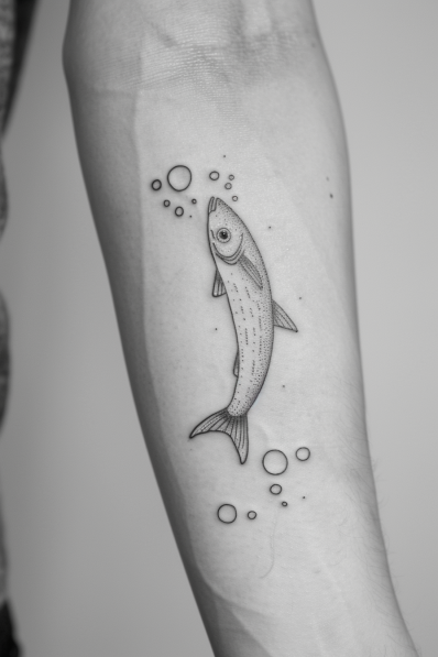 This delightful tattoo features a single sardine surrounded by a playful arrangement of bubbles, giving it a light and whimsical underwater vibe. The sardine is drawn with fine lines and soft shading, creating a clean and elegant look, while the bubbles add movement and depth to the design. The simplicity of the piece makes it both subtle and striking.