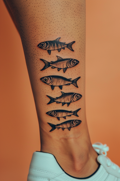 This tattoo features a quirky lineup of five sardines, each drawn with bold outlines and subtle shading for texture. The fish are stacked vertically, giving the design a fun and orderly vibe, almost like they re swimming in formation. Each sardine is slightly unique, with slight variations in the shading and detailing that add character to the design.