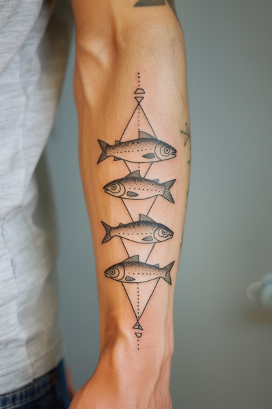 I think this tattoo is an awesome blend of nature and design. The combination of the sardines and the geometric shapes feels fresh and unique, like a creative take on traditional fish tattoos. It s structured yet lively, making it perfect for someone who loves both order and the natural flow of marine life. It s stylish, sharp, and definitely makes a statement this is one you d proudly show off!