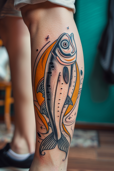 I m obsessed with how creative this design is! The vibrant orange backdrop gives the sardine a fiery energy, almost like it s the star of its own little galaxy. It s such a cool mix of realism and artistic flair definitely not your average fish tattoo. If you re looking for something bold and unique, this one is a total conversation starter. I d be showing it off any chance I got!