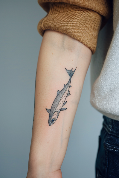 This minimalist tattoo showcases a single sardine, detailed with clean, bold lines and precise shading. The intricate scales, fins, and wide-open eye bring the fish to life, giving it an expressive and almost whimsical vibe. The simplicity of the design makes it versatile and timeless while still capturing the essence of a sardine in a visually striking way.