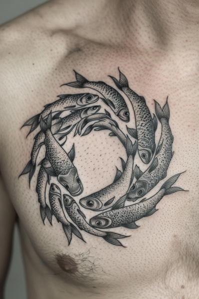 This striking tattoo features a mesmerizing circular formation of sardines, swimming in unison to create an almost hypnotic flow. Each fish is intricately detailed, with scales, fins, and eyes that pop beautifully. The shading is expertly done, giving the design depth and dimension while still maintaining a clean, cohesive look. The circular layout creates a sense of movement and harmony, making it a truly captivating design.