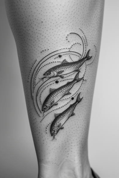 This captivating tattoo features three sardines in mid-swim, surrounded by flowing swirls and dotted accents that mimic water currents. The fish are detailed with textured scales and fine shading, giving them a lifelike appearance. The swirling lines add motion and energy to the piece, creating a design that feels alive and in harmony with nature.
