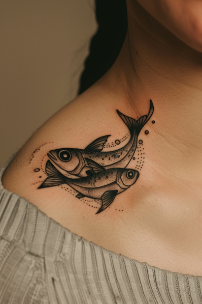 This charming tattoo features two sardines swimming in a harmonious flow, connected by soft dotted lines and small bubble-like accents. The sardines are shaded with intricate detail, highlighting their scales and fins, while the minimalistic background keeps the focus on their graceful motion. The design feels balanced and perfectly captures a sense of companionship or duality.