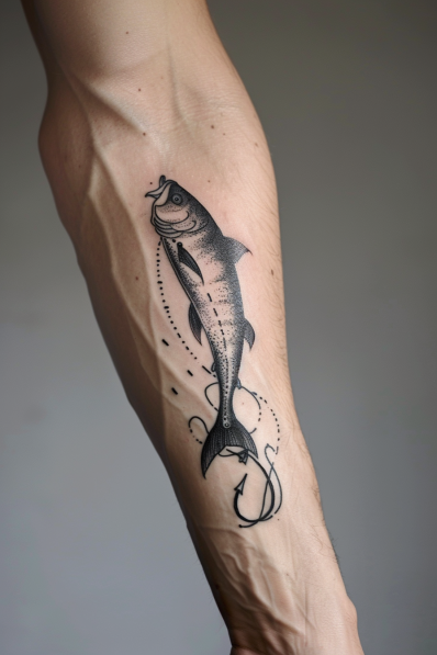 I absolutely love how this tattoo tells a story it s like capturing a moment of action frozen in time. The hook brings a playful nod to fishing without being overly literal, and the dotted lines add a contemporary flair. It s great for anyone who wants a unique marine-inspired tattoo with a bit of personality and humor. Honestly, it s sleek, clever, and just the right amount of quirky!