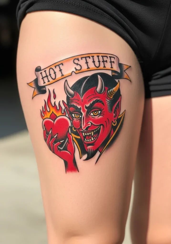 This cheeky thigh tattoo features a grinning red devil holding a flaming heart beneath a banner that reads Hot Stuff. The design is full of life with bold outlines, radiant reds, and warm yellows that perfectly capture old-school tattoo flair.