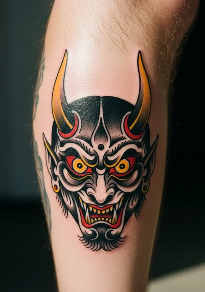 This leg tattoo shows off a fierce devil mask with glowing yellow eyes and golden horns that practically jump off the skin. The shading is deep and smooth, moving from black to red seamlessly. Every detail from the teeth to the horns screams precision and boldness in perfect old-school style.