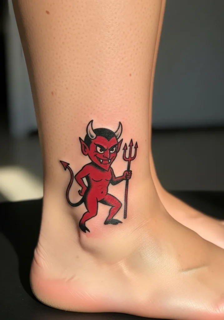 This small ankle tattoo features a mischievous red devil holding a trident, perfectly capturing the charm of traditional flash designs. The clean black lines and pop of red ink make it simple yet full of character. It s playful, compact, and looks adorable with the natural curve of the ankle.