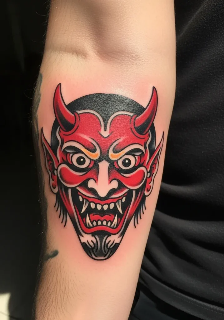 This bold American Traditional devil tattoo sits perfectly on the forearm, flaunting thick black outlines and vibrant red shading that glows against the skin. The devil s fierce grin, sharp fangs, and intense yellow eyes capture the essence of vintage tattoo rebellion. The clean, saturated colors and solid black fill give it that unmistakable old-school toughness.