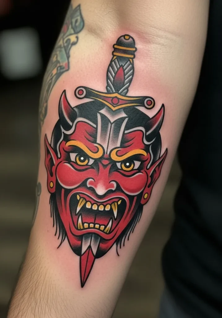 This dramatic devil head tattoo on the arm features a gleaming dagger piercing through the top of the skull. The bold red face, golden eyes, and crisp black shading keep it authentically American Traditional, while the weapon detail adds a touch of storytelling. The composition fits the arm beautifully, making it both bold and balanced.