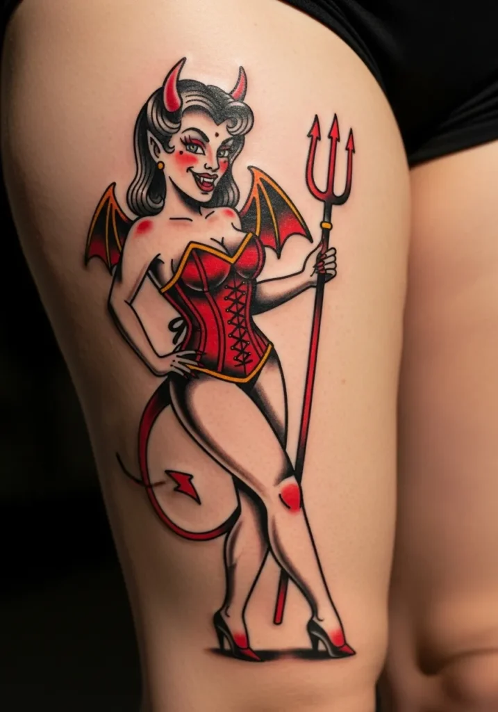This playful thigh tattoo brings a vintage pin-up twist to the devil theme. The red corset, heels, and pitchfork give the character a flirty confidence, while the bold black outlines and warm yellow highlights stay true to American Traditional style. The design is large and eye-catching, curving perfectly with the thigh s natural shape.