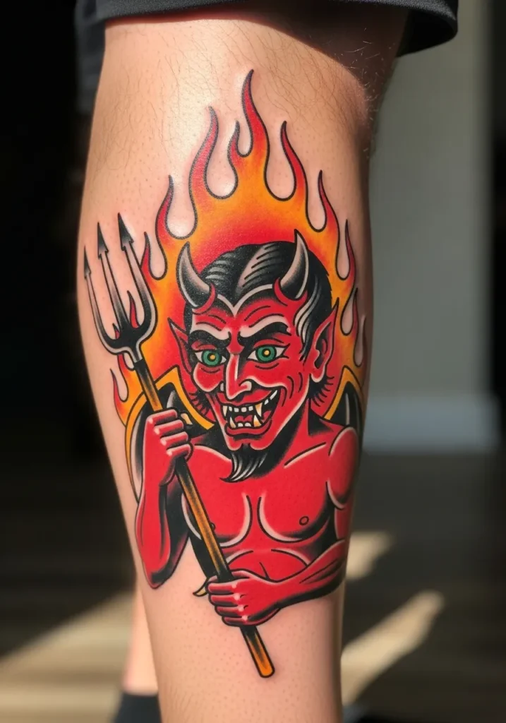 This devil tattoo on the calf brings serious attitude, featuring a muscular red devil surrounded by orange flames, holding a trident with a grin that s equal parts wicked and fun. The thick outlines, saturated reds, and fiery yellows keep it true to classic American Traditional style.