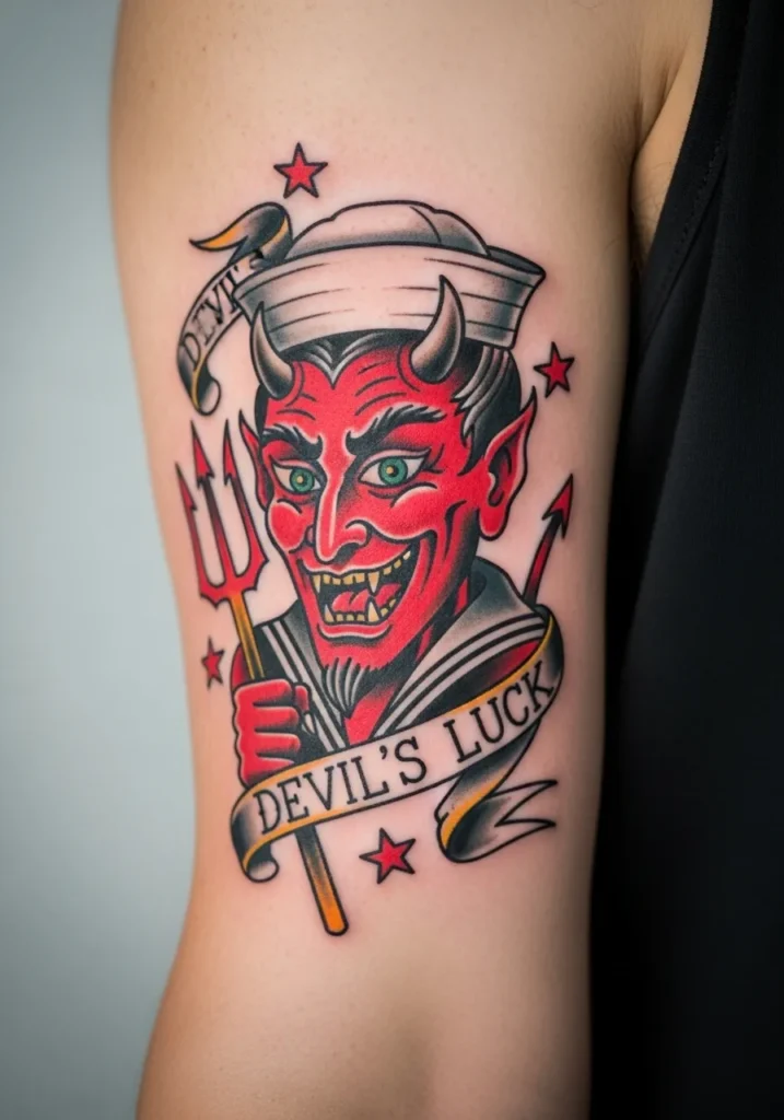 This old-school sailor-style devil tattoo bursts with character, featuring a red devil in a vintage sailor cap, holding a trident beside a banner that reads Devil s Luck. The clean lines, bright colors, and bold shapes give it that perfect flash-sheet energy.