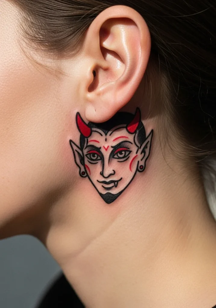 This tiny devil head tattoo behind the ear proves that small can still be fierce. With its classic red-and-black color scheme, pointy horns, and sly smirk, it channels that old-school vibe while keeping things subtle. The placement is clever and edgy, perfect for someone who loves tattoos with personality but wants something more discreet.
