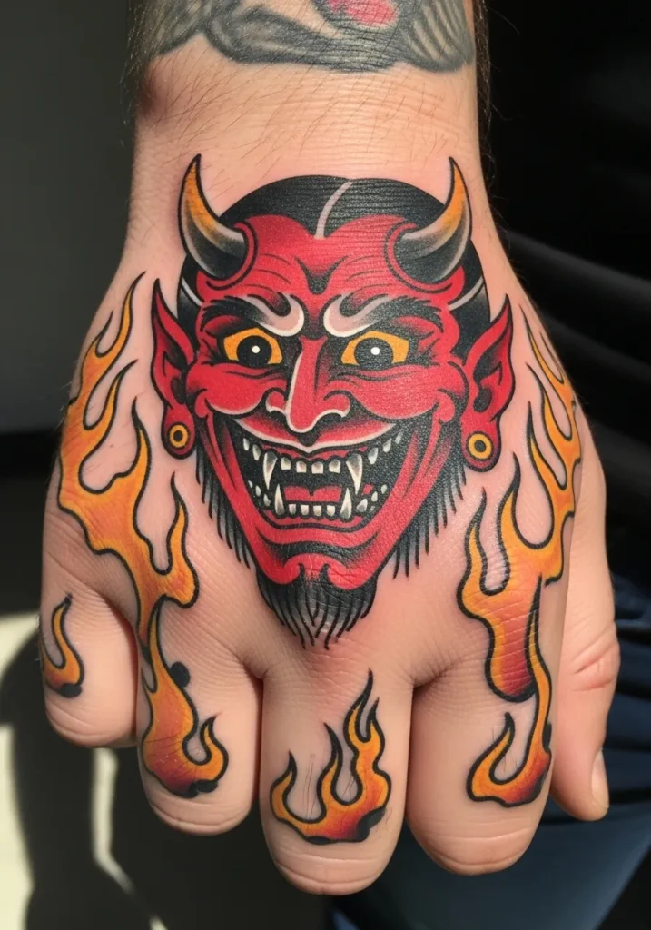 This fiery devil tattoo sits right on the hand, and it s impossible to miss. The devil s head bursts from the skin in vibrant reds and blacks, surrounded by flames that lick across the fingers. The bold outlines and saturated colors make it a perfect American Traditional piece, packed with attitude in a small space.