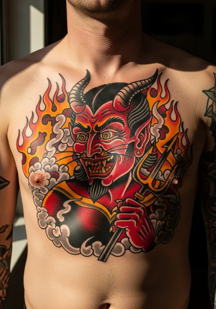 This bold chest tattoo lights up the entire torso with a flaming red devil gripping a golden trident. Surrounded by clouds of smoke and bright orange flames, the design bursts with traditional style and power. The thick black outlines and perfect color saturation make every detail from the devil s wicked grin to his curling horns feel alive and intense.