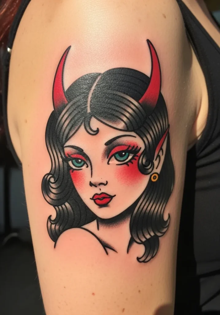 This stunning upper arm tattoo reimagines the devil as a beautiful woman with glossy black hair, soft red skin, and subtle shading. Her expression is both confident and mysterious, giving off major vintage pin-up energy. The simple color palette of red, black, and gold keeps it classic and timeless.