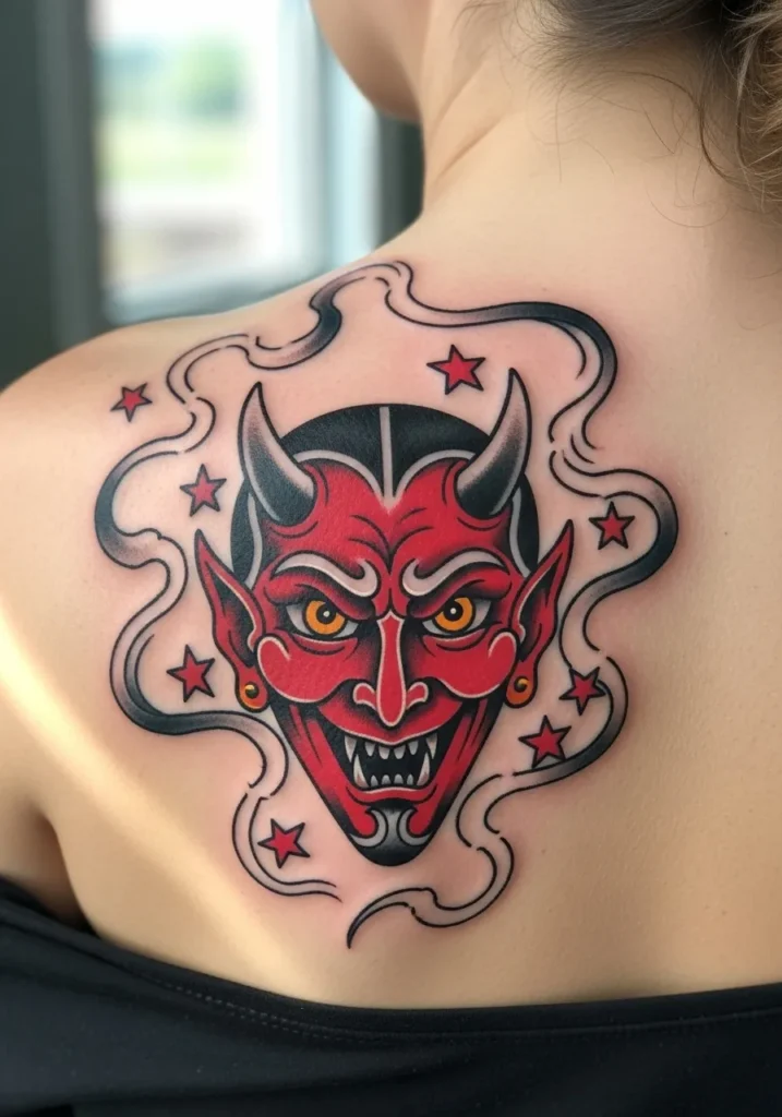This striking shoulder blade tattoo features a bright red devil face framed by swirling smoke and tiny red stars. The clean lines and strong black shading give it that classic old-school charm, while the placement makes it elegant yet daring. The red, yellow, and black tones create a perfect vintage balance.