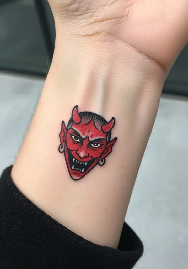 This small red devil tattoo on the wrist is minimal but mighty. The sharp horns, bright eyes, and cheeky grin are all captured in clean, crisp lines. The compact size makes it ideal for a first tattoo or for someone who loves the retro vibe without going too big.
