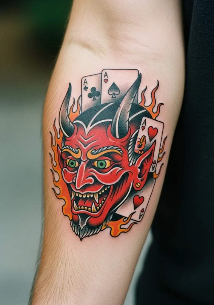 This devil head tattoo on the forearm takes center stage with flames, four aces, and bold American Traditional coloring. The fiery reds and oranges contrast perfectly with the black-and-white cards, creating a design that feels energetic and full of movement.