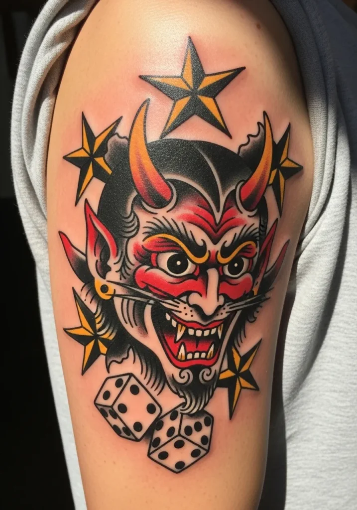 This American Traditional devil tattoo on the upper arm pairs the fiery face of a devil with bold yellow stars and a pair of dice. The color palette of red, black, and gold pops beautifully on the skin, and the symmetry between the elements gives it a clean yet fierce aesthetic.