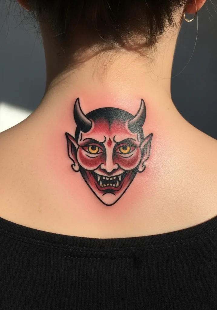 This clean and compact devil head tattoo sits neatly on the upper back, glowing with bright red and yellow hues. The expression is fierce yet traditional, with sharp teeth, pointed horns, and that signature bold outline that defines American Traditional work.