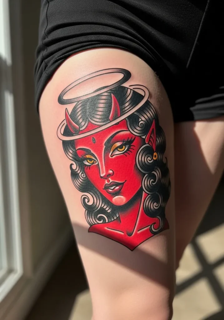 This gorgeous thigh tattoo features a red-skinned devil woman with golden eyes, soft curls, and a halo hovering above her horns. The combination of black shading and bright red tones gives it that bold, vintage flash look that feels both sultry and strong.