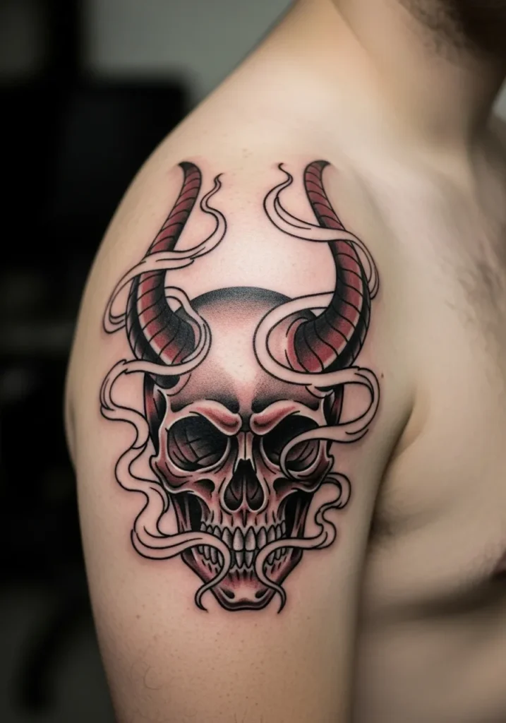 This shoulder tattoo combines two classic icons a skull and a pair of devil horns. The soft shading in black and gray creates a smoky, atmospheric feel, while the curved horns and swirling details add a dramatic edge. It s a slightly darker take on the American Traditional style but still holds that clean, timeless structure.