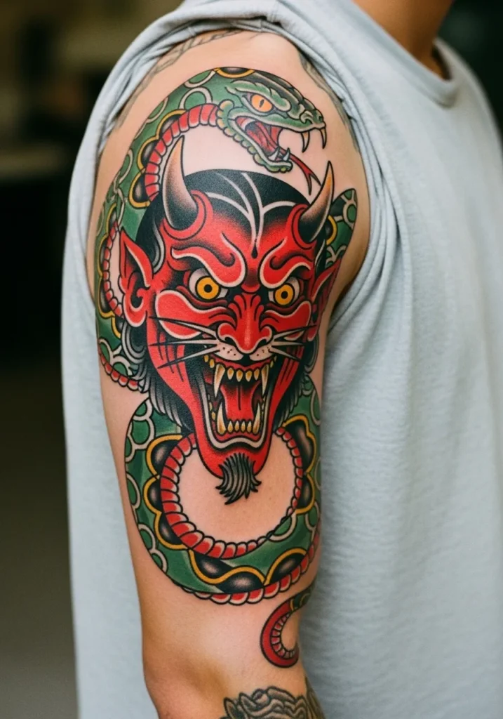 This large American Traditional devil and snake tattoo wraps powerfully around the upper arm, creating a bold statement from every angle. The vivid red of the devil s snarling face contrasts beautifully with the deep green of the coiled snake. Thick black outlines, golden eyes, and sharp white teeth make the details pop while the classic shading keeps everything crisp and balanced.