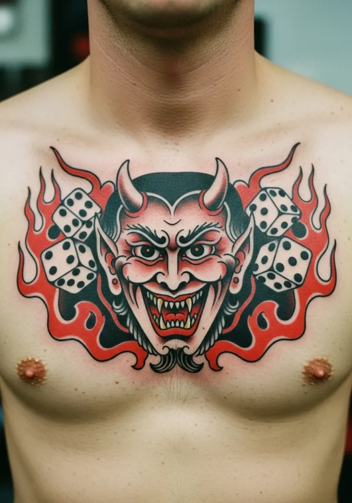 This striking chest tattoo turns the devil motif into a full centerpiece design, surrounded by flames and lucky dice. The bright reds, deep blacks, and creamy whites come together in a flawless American Traditional palette. The crisp outlines and symmetrical layout make it feel balanced yet full of energy.