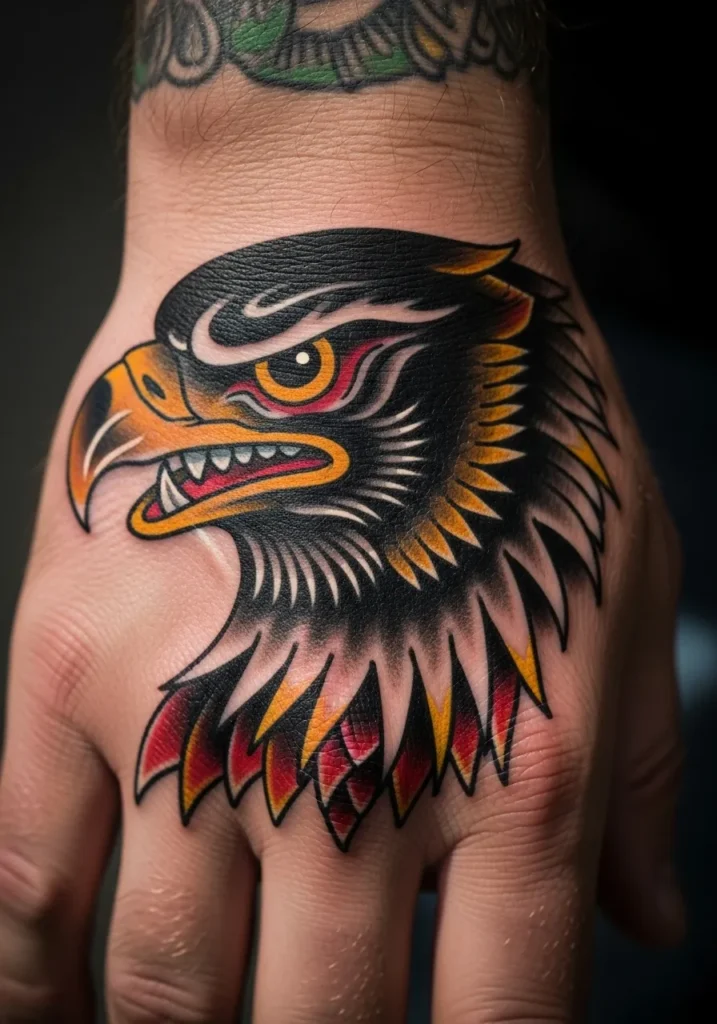 This striking hand tattoo features a fierce eagle head rendered in the bold American traditional style. The sharp beak, fiery orange and red tones, and thick black lines make it look strong and powerful. Every feather is outlined with precision, flowing naturally toward the wrist.