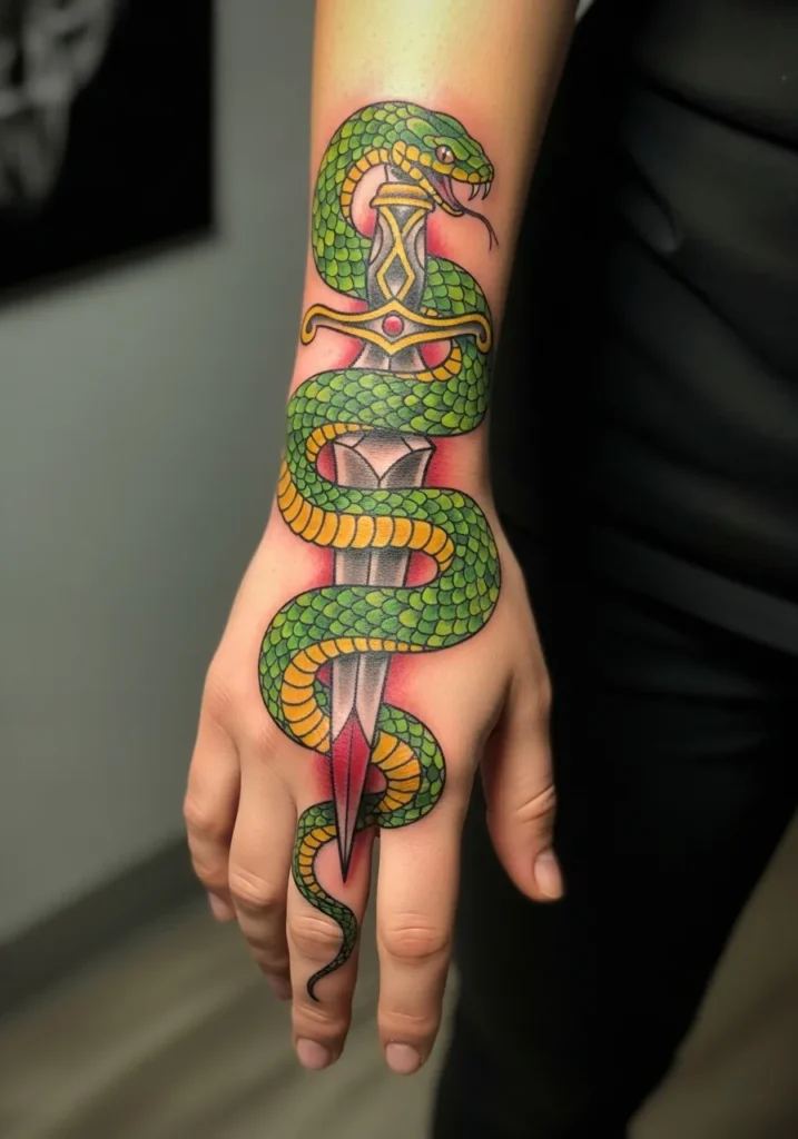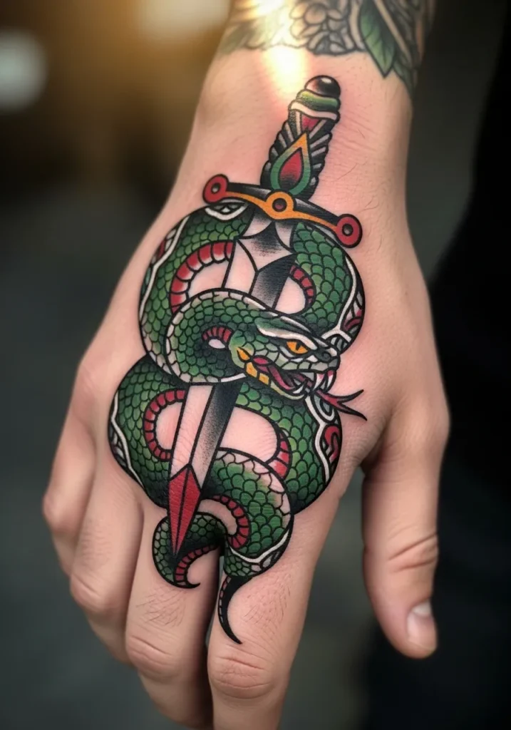 This bold hand tattoo shows a classic American Traditional snake wrapped tightly around a gleaming dagger. The green and red tones pop beautifully against the skin, while the thick black outlines give it that timeless sailor-style charm. The placement makes it a true statement piece, extending across the hand with perfect balance between color, detail, and shape.