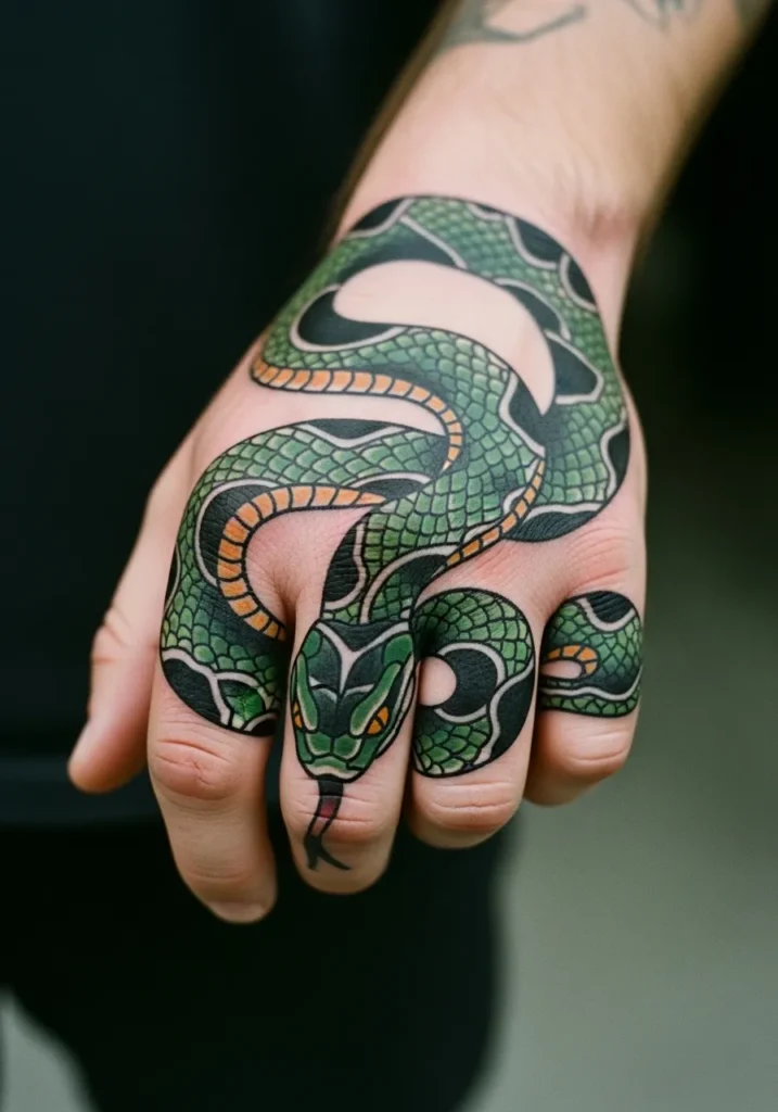 This striking tattoo features a green snake wrapping naturally across the hand and fingers, its head resting near the knuckles with a sharp, lifelike stare. The scales are rendered in classic American Traditional style with solid black outlines, deep green and orange tones, and smooth shading that gives the illusion of movement. It fits the hand s contours perfectly, creating a seamless, flowing look.