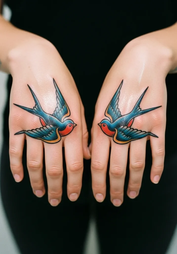 These matching swallow tattoos sit gracefully on the tops of both hands, each bird flying inward in a perfect mirror image. The blue and red tones pop against the skin, highlighted by clean black outlines and a smooth, even shading that gives the wings a subtle curve.
