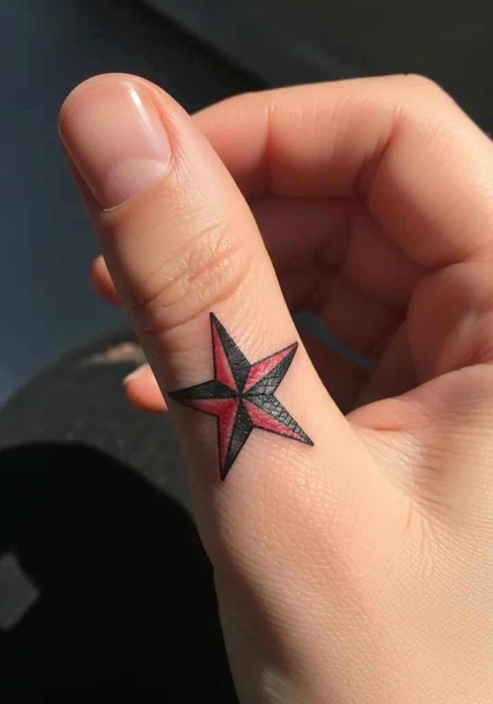 This small black and red nautical star sits perfectly on the side of the thumb, proving that even tiny tattoos can make a strong statement. The clean, crisp lines and contrasting shades create that signature bold American traditional charm, while the placement gives it a personal, almost secret feel.