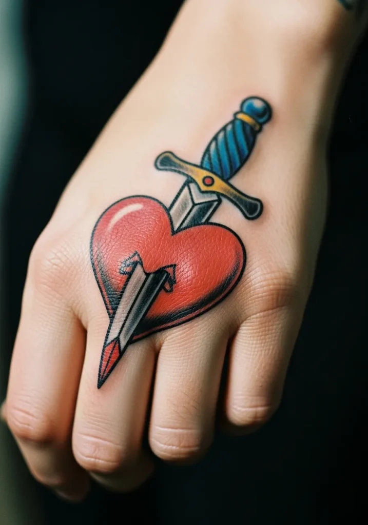 This tattoo shows a gleaming dagger piercing through a bright red heart, sitting perfectly centered on the hand. The clean lines, blue hilt, and subtle highlights make it a textbook example of American traditional craftsmanship. The simplicity gives it instant impact.