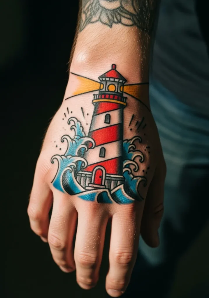Here s a stunning hand tattoo of a red and white lighthouse standing strong against crashing blue waves. The beam of yellow light cuts across the design, giving it that hopeful touch. The clean lines and bold colors are unmistakably American traditional, and the hand placement makes it feel like a small beacon shining right from your skin.