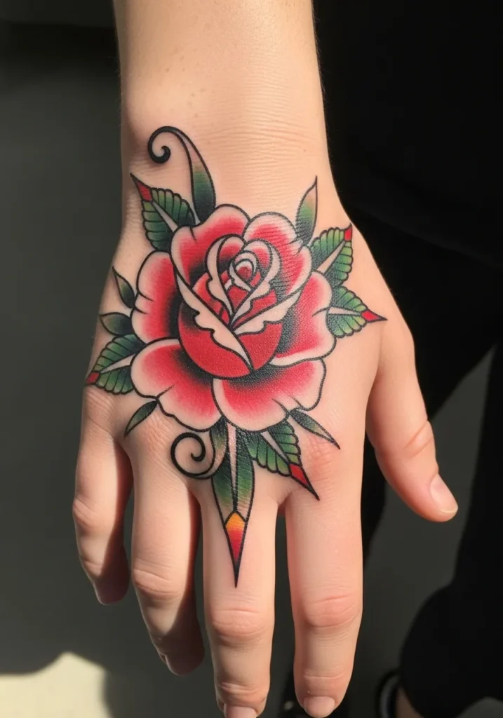 This American traditional rose tattoo covers the top of the hand beautifully, with crisp black outlines, rich red petals, and deep green leaves that fan out naturally over the knuckles. The piece feels alive under soft daylight, showing subtle skin texture and the slightly raised ink that gives it a fresh, authentic look.