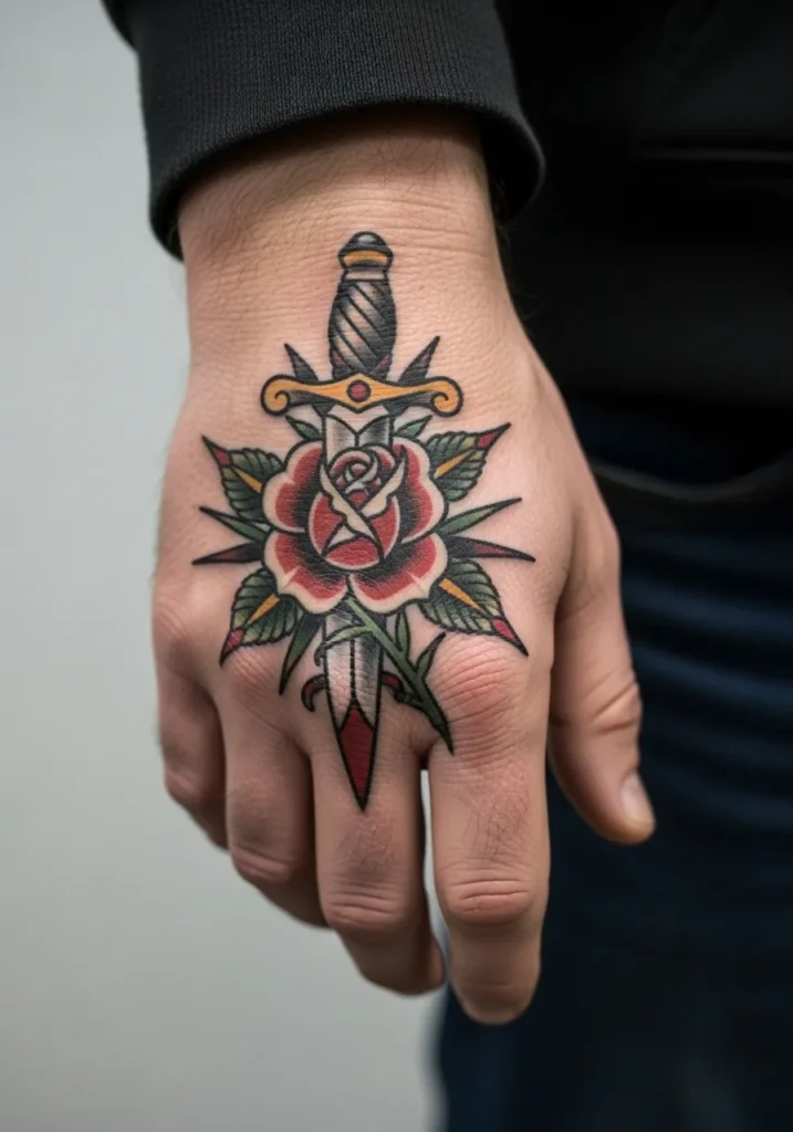 This hand tattoo features a classic American traditional pairing a dagger piercing through a red rose surrounded by green leaves. The design sits neatly across the top of the hand, with the blade extending downward for a balanced look. Deep reds, gold accents, and bold outlines make it pop beautifully against the skin.