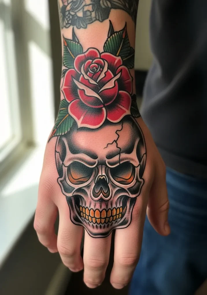 This bold hand tattoo combines two American traditional staples a cracked skull with hollow orange eyes and a blooming red rose above it. The strong black shading gives the design real depth, while the bright petals bring a burst of life to the darker imagery.